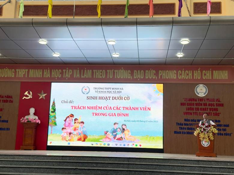Ngày 8/12/2025, trường THPT Minh Hà đã tổ chức buổi Sinh hoạt dưới cờ với chủ đề “Trách nhiệm của các thành viên trong gia đình”, do Tổ Khoa học Xã hội thực hiện. Chương trình nhằm giúp học sinh hiểu rõ hơn vai trò, bổn phận và giá trị của trách nhiệm trong đời sống gia đình – nền tảng quan trọng hình thành nhân cách của mỗi con người.