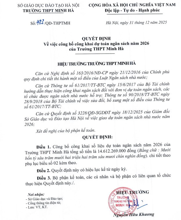 THÔNG BÁO QUYẾT ĐỊNH VỀ VIỆC CÔNG BỐ CÔNG KHAI DỰ TOÁN NGÂN SÁCH NĂM 2026